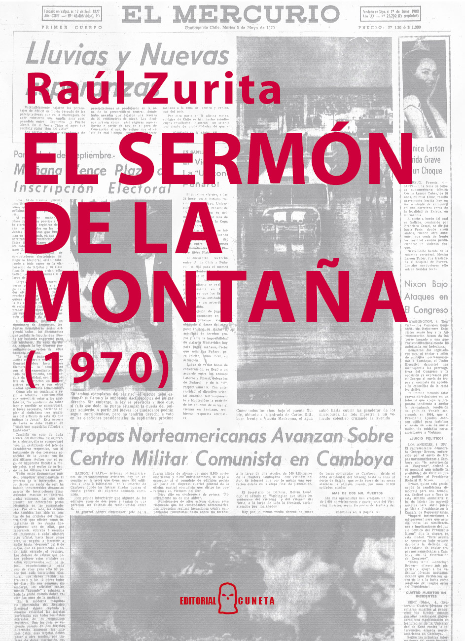 | Reseña | El futuro tiene la propiedad de crear su pasado, sólo desde ese más allá sabemos qué aspectos del pretérito adquieren el valor de suceso o marca distintiva. El Sermón de la montaña (1971), ópera prima del poeta Raúl Zurita, pasa hoy a formar parte del pasado donde se inaugura la tradición zuritiana. El texto fue escrito en 1970 y publicado en 1971 en el número único de la revista Quijada, perteneciente al Centro de humanidades de la Universidad técnica Federico Santa María, en Valparaíso, donde Zurita estudiaba ingeniería civil (1967-1973), pero a cuyo lugar nunca volvió, tras el Golpe militar y haber sido detenido en 1973. (Magda Sepúlveda) |